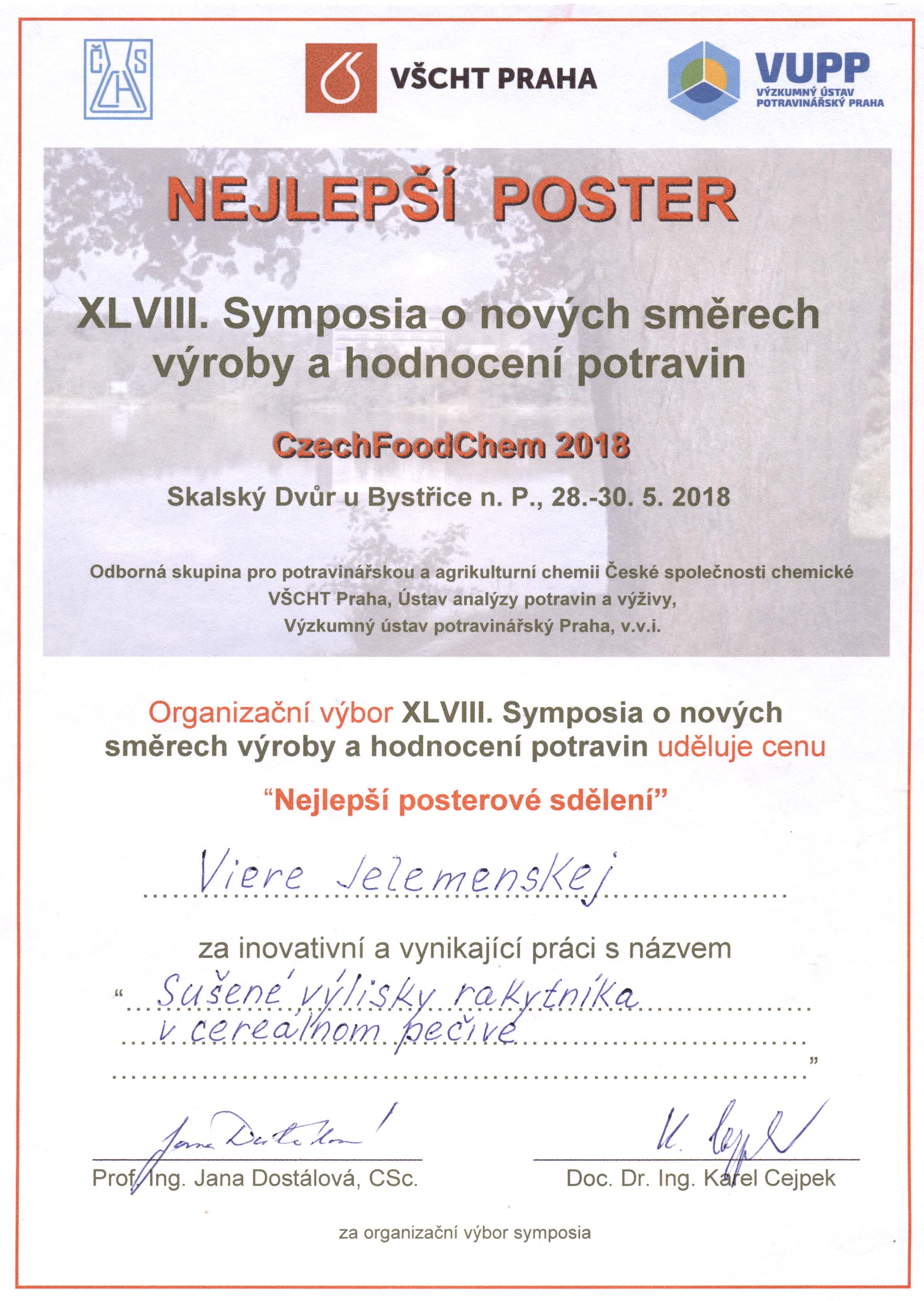 - Ing. Viera Jelemenská (the best poster presentation award at CzechFoodChem XLVIII, Skalský Dvůr, Czech Republic, 2018)