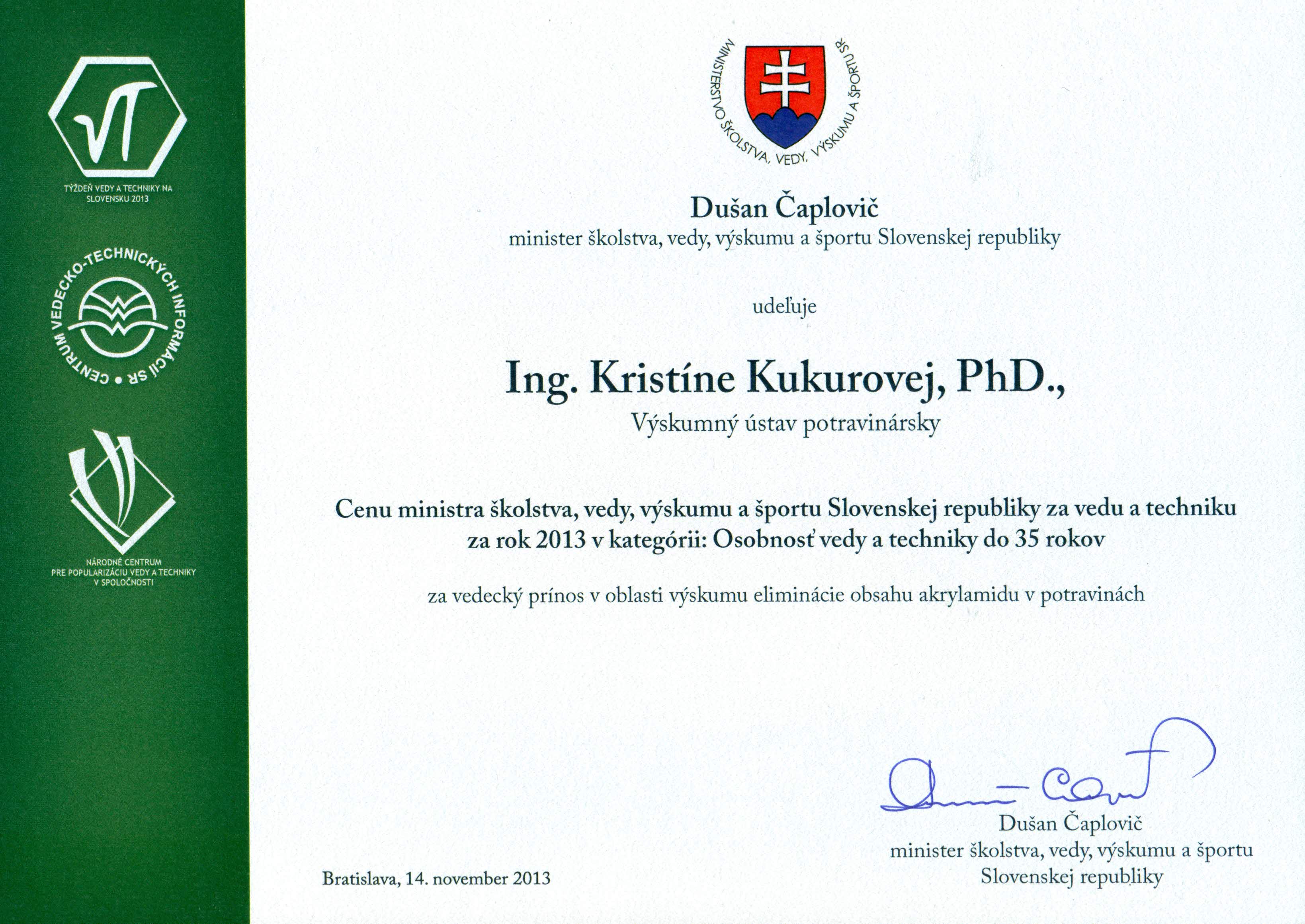 - Ing. Kristína Kukurová, PhD. (personality of science and technology up to 35 years award of the Minister of education, science, research and sport of the Slovak republic, 2013)