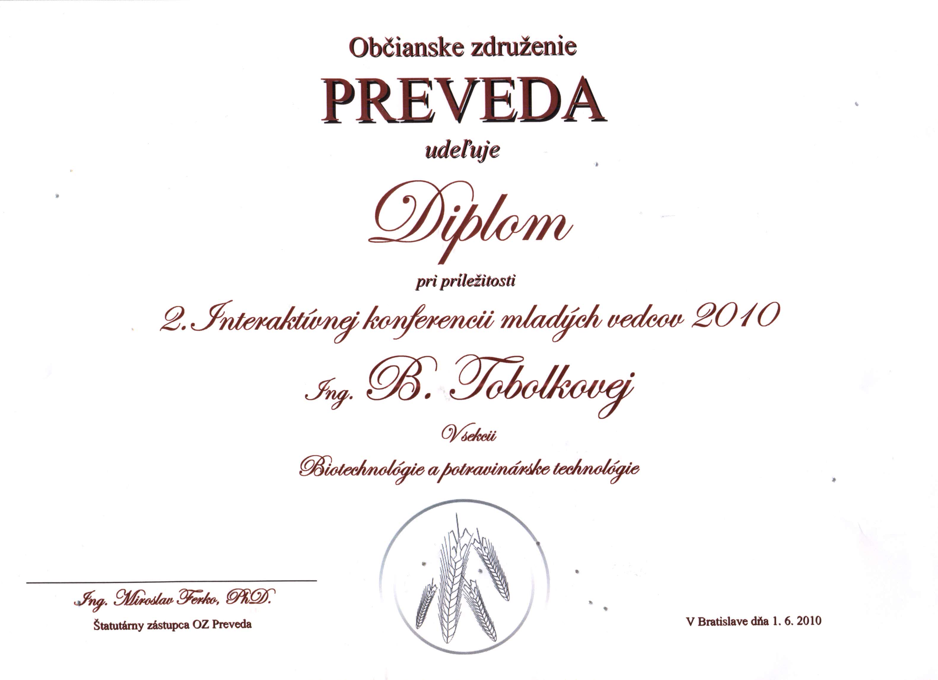 - Ing. Blanka Tobolková, PhD. (the best contribution at interactive conference for young scienticts in the section for biotechnology and food technology, Preveda 2010)